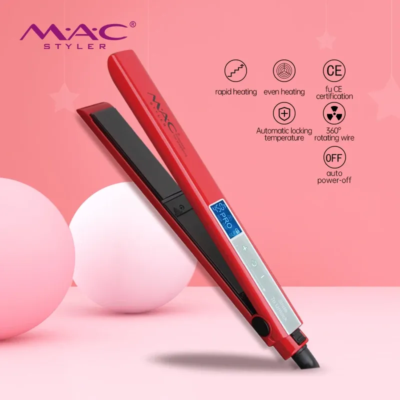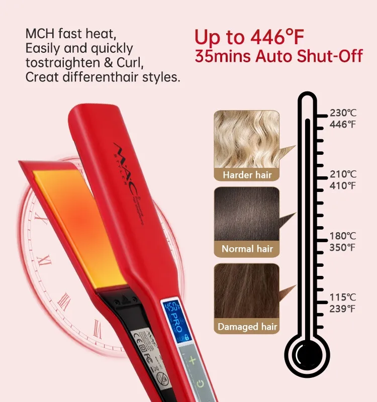 مكواة فرد الشعر 45OF مع ألواح سيراميك 1 بوصة. توفر تقنية السيراميك حرارة عالية ومتساوية تتغلغل في الشعر من الداخل إلى الخارج، مما يساعد الشعر على الاحتفاظ برطوبته الطبيعية للحصول على تسريحات خالية من التجعد. يتم تسخينه خلال 30 ثانية ويستعيد الحرارة بشكل فوري ويتميز بقرص مقاومة متغيرة مع إعدادات حرارة متعددة لتصفيف أي ملمس وسمك للشعر. يتميز بمقبض تلقائي الإغلاق وسهل الإمساك وشاشة LCD وسلك دوار خالٍ من التشابك.